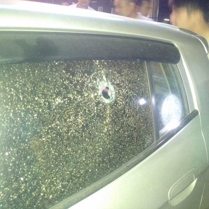 Rất may phát bắn không trúng nhân viên đó mà làm thủng kính một chiếc xe ô tô đỗ gần đó (đường kính thủng từ 5-7cm).