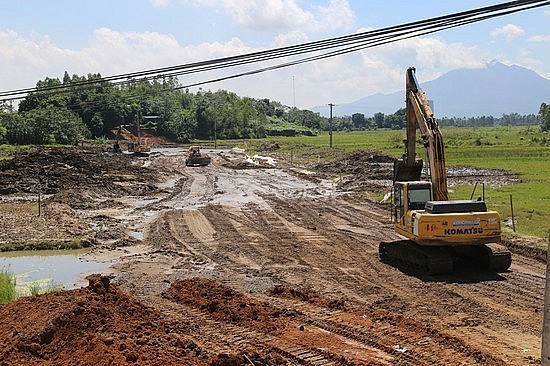 | Thi công phần nền đường đoạn qua xã Thạch Khoán, huyện Thanh Sơn. |