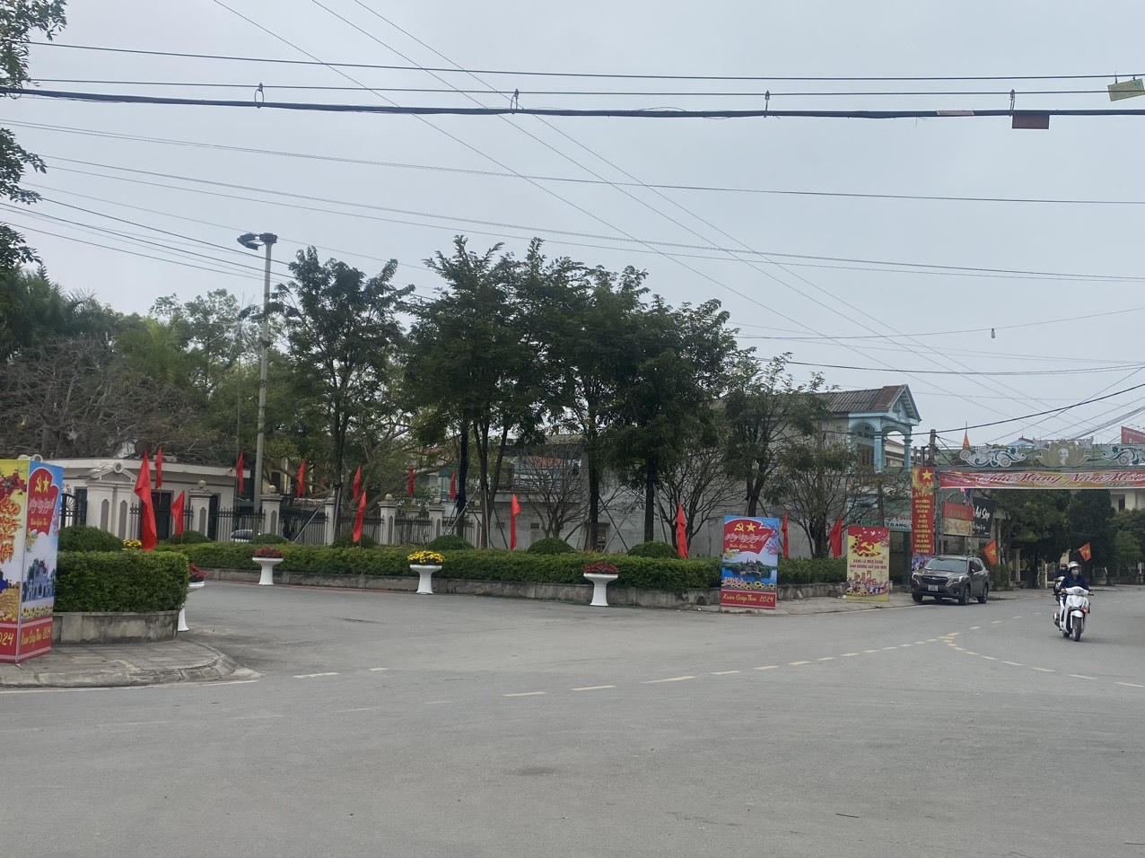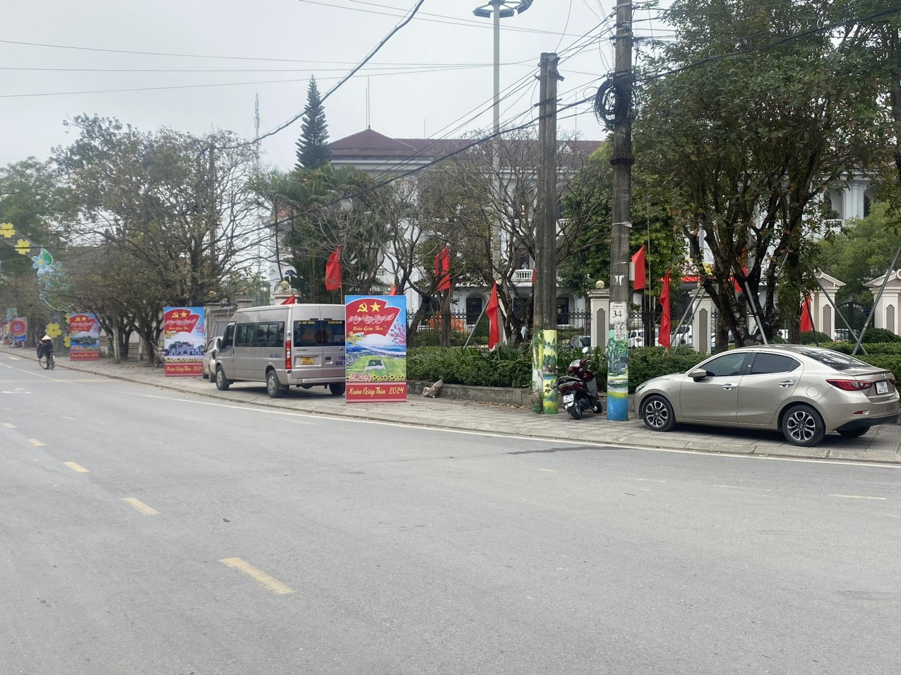 Các tuyến phố lối vào trụ sở UBND huyện Hà Hoà đã được trang hoàng cờ hoa, băng rôn, bảng hiệu rực rỡ mừng Đảng và chào đón Tết Nguyên đán Giáp Thìn.