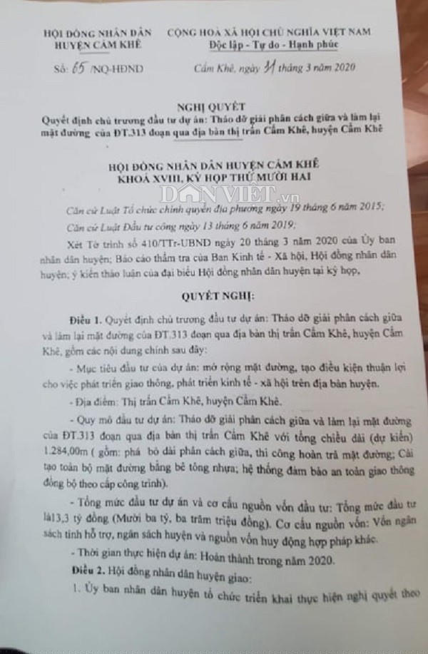 Tìm hiểu của Dân Việt, ngày 31/3, ông Hà Đức Huynh, Chủ tịch HĐND huyện Cẩm Khê đã ký Nghị quyết số 65/NQ-HĐND về quyết định chủ trương đầu tư dự án: Tháo dỡ dải phân cách giữa và làm lại mặt đường của tỉnh lộ 313 đoạn qua địa bàn thị trấn Cẩm Khê, huyện Cẩm Khê, tỉnh Phú Thọ.
