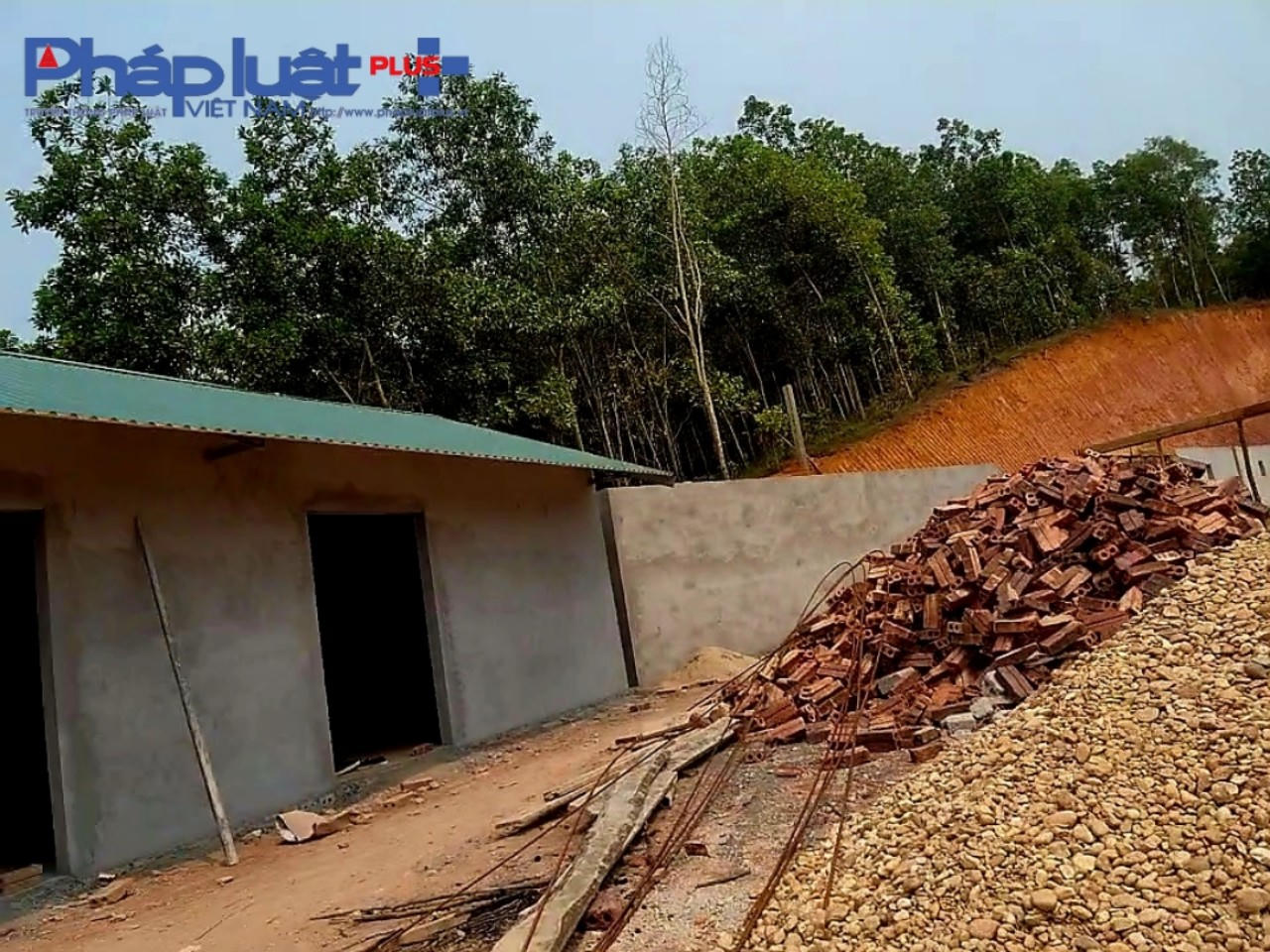 Vật liệu xây dựng gồm gạch cát xi măng sắt thép vứt ngổn ngang giữa hiện trường còn mới tinh, màu đất đỏ tươi chứng tỏ việc đào bới hủy hoại đất rừng mới chỉ được dừng lại trong khoảng thời gian chưa lâu, còn việc thi công xây dựng đang được tiến hành khẩn trương mau chóng hoàn thiện