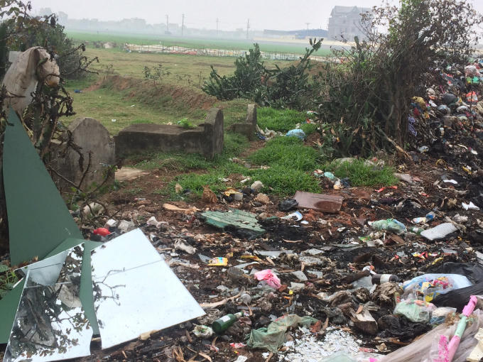 "Đến bữa ăn nếu quên không đóng cửa nhanh thì ăn chung với ruồi. Chúng tôi thường trêu nhau là sống chung với lũ. Không những người sống bị ảnh hưởng, mà người chết cũng chẳng yên. Em nhìn đấy thì biết, rác thải ngày càng lấn chiếm cả nơi chôn cất người đã mất. Bên cạnh đó, cách đó khoảng 300m là Trường mầm non, lại đúng theo hướng gió thổi nên mỗi lần các vị ấy đốt rác là lại khổ các cháu. Nếu tôi có con, cháu không bao giờ cho học ở đấy, không phải vì chất lượng mà vì ô nhiễm từ rác thải”, anh T. bức xúc nói.