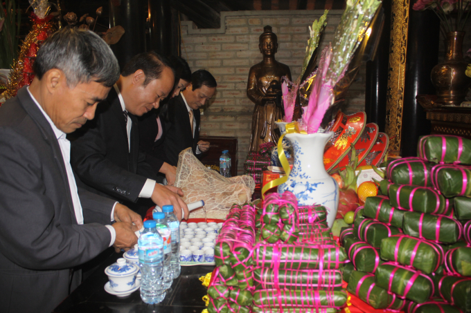 | Các đồng chí lãnh đạo vào Thượng điện dâng lễ vật, hương và hoa lên bàn thờ Tổ Mẫu. |