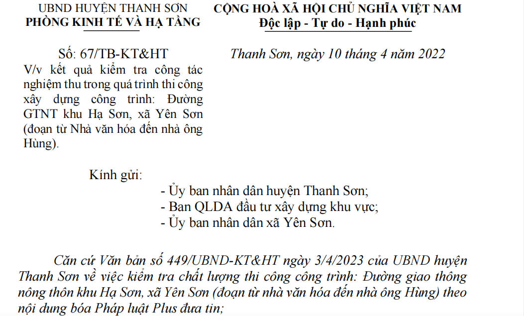 Theo đó, tại báo cáo số 67/TB-KT&HT do ông Vũ Trọng Đức, Trưởng phòng Kinh tế và Hạ tầng huyện Thanh Sơn đã có báo cáo kết quả kiểm tra công tác nghiệm thu trong quá trình thi công xây dựng công trình: Đường GTNT khu Hạ Sơn, xã Yên Sơn (đoạn từ Nhà văn hóa đến nhà ông Hùng) cụ thể như sau: