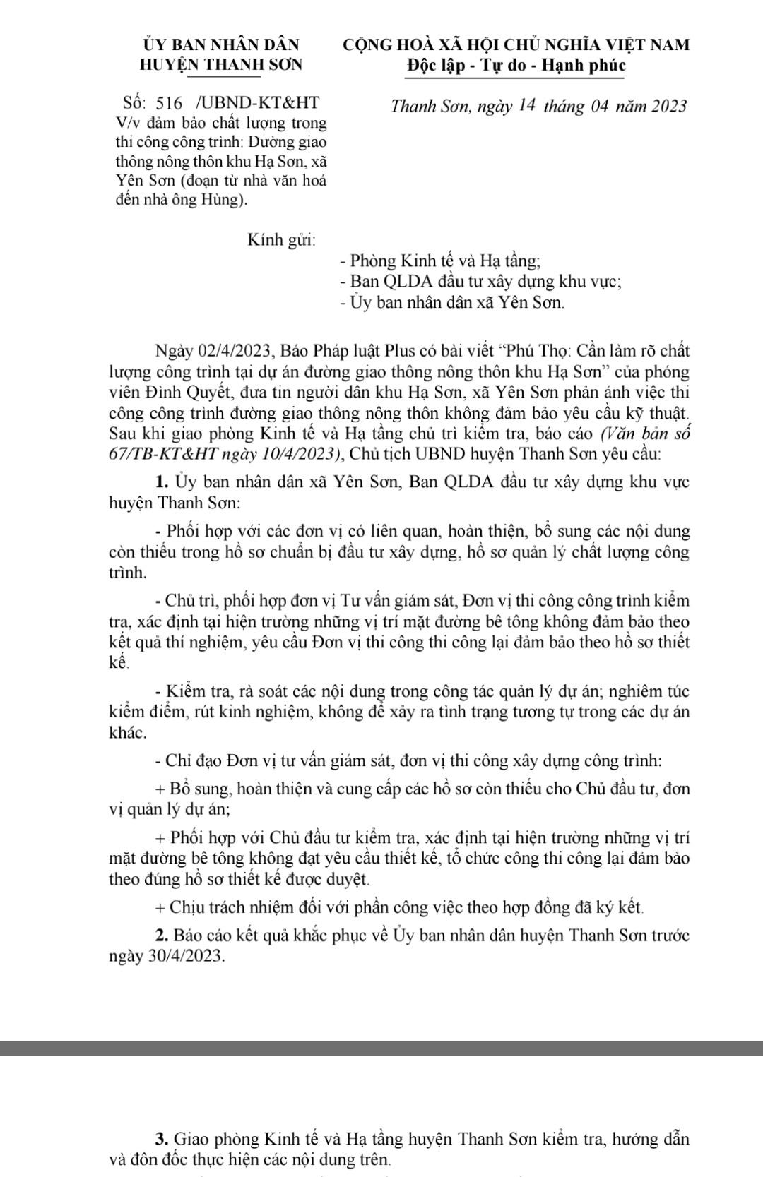 Ngay sau khi nhận được thông tin Báo Pháp luật Việt Nam đăng tải, ngày 14/4/2023 UBND huyện Thanh Sơn đã có công văn số 516/UBND-KT&HT do bà Đinh Thị Kiều An, Phó chủ tịch UBND huyện Thanh Sơn ký gửi Phòng Kinh tế và Hạ Tầng; Ban QLDA đầu tư xây dựng khu vực và UBND xã Yên Sơn yêu cầu UBND xã Yên Sơn, Ban QLDA đầu tư xây dựng khu vực huyện Thanh Sơn phối hợp với các đơn vị có liên quan hoàn thiện, bổ sung các nội dung còn thiếu trong hồ sơ chuẩn bị đầu tư xây dựng, hồ sơ quản lý chất lượng công trình.