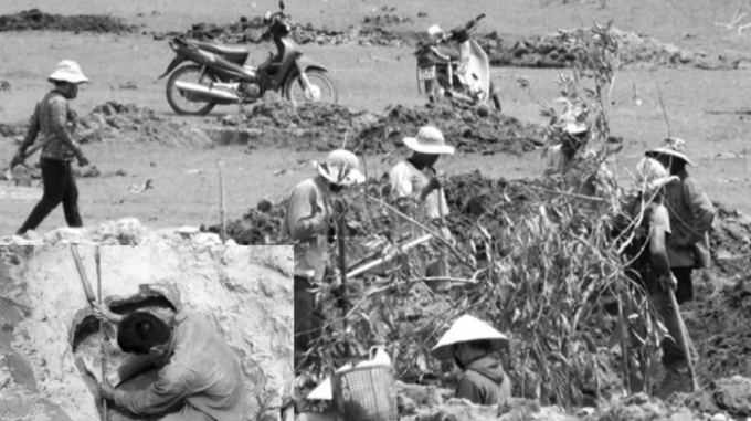 Tại khu vực xã Ea Trol (huyện Sông Hinh), từng tốp người mang theo cuốc, xẻng, xà beng đến vùng bán ngập lòng hồ thủy điện Sông Hinh để đào đất tìm đá đen. Ở đây, ngoài thanh niên còn có người già, phụ nữ, nhiều hộ còn đi cả gia đình để cùng đào tìm đá.