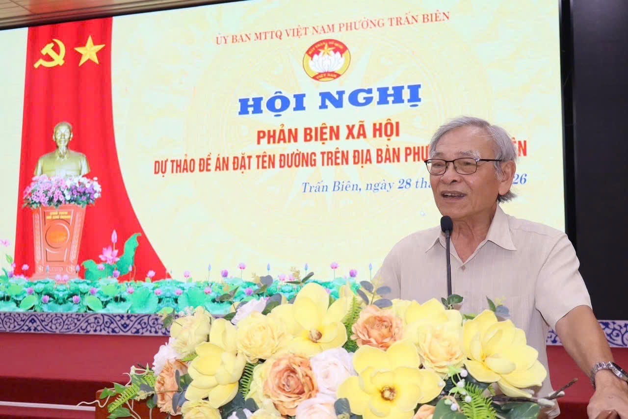 Chiều 28/4/2026, Ủy ban MTTQ Việt Nam phường Trấn Biên (tỉnh Đồng Nai) tổ chức Hội nghị lấy ý kiến phản biện xã hội đối với dự thảo đề án đặt tên đường thuộc hai dự án giao thông trọng điểm trên địa bàn, gồm: dự án Đường Trục Trung tâm và dự án Đường ven sông Đồng Nai.
