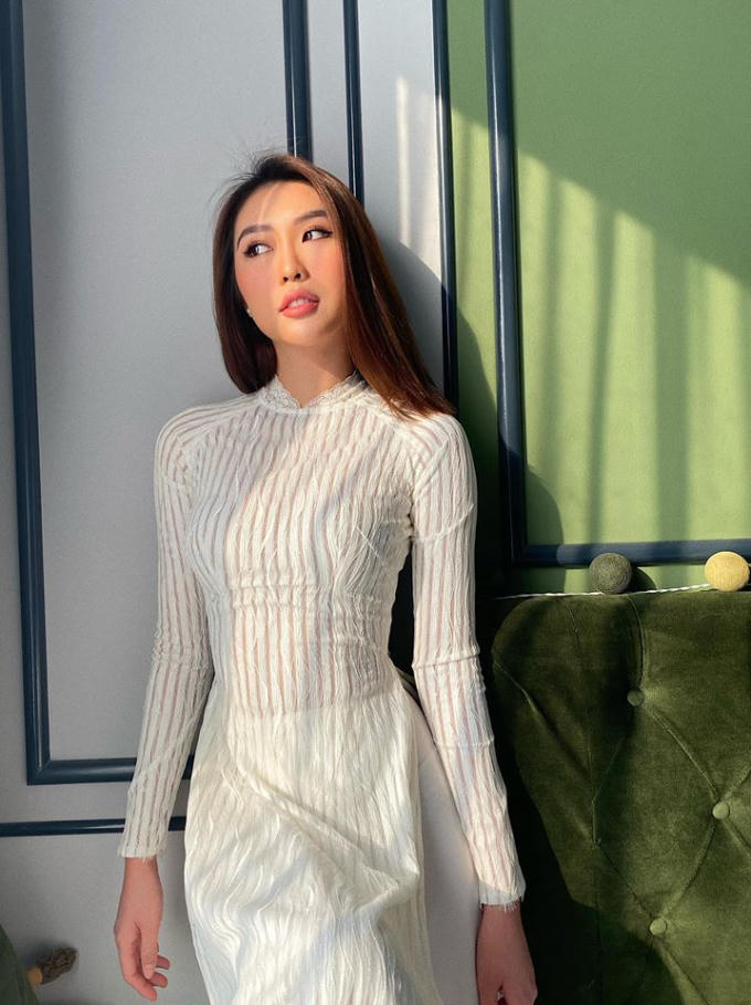 Hoa hậu Tường Linh diện áo dài duyên dáng hút mọi ánh nhìn nhưng cô vẫn khiêm tốn chia sẻ: "Cháu sắp được đi học lại rồi nhưng khổ nỗi áo thì chật, mặt thì mập".