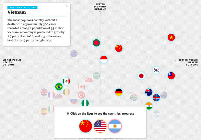 Việt Nam được nhận xét là nước đông dân mà không có trường hợp tử vong nào do COVID-19. Việt Nam có khoảng 300 ca bệnh được ghi nhận trong dân số khoảng 95 triệu người. Nền kinh tế Việt Nam được dự báo tăng trưởng 2,7% trong năm 2020, giúp Việt Nam lọt vào nhóm nhìn chung có kết quả chống COVID-19 tốt nhất trên toàn cầu.