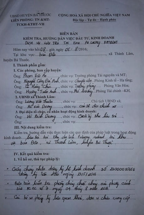 Sau khi kiểm tra, lực lượng chức năng huyện cùng lãnh đạo UBND xã Thành Lâm phát hiện nhiều thủ tục cấp thiết còn thiếu tại Puluong Retreat. Cụ thể, khu nghỉ dưỡng này thiếu các phương án phòng cháy chữa cháy, phương án đảm bảo an ninh trật tự, bảo vệ môi trường…
