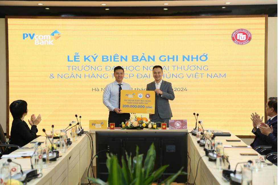Với chiến lược đồng hành trong công tác phát triển tài năng, tại khuôn khổ lễ ký kết, đại diện PVcomBank đã trao tặng trường Đại học Ngoại Thương 2 suất học bổng Thắp Sáng Niềm Tin với trị giá 200 triệu đồng, mong muốn trở thành điểm tựa tài chính, giúp các sinh viên vững tin trên con đường học tập.