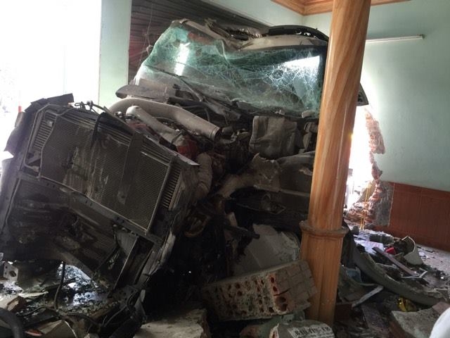 | Cận cảnh ngôi nhà bị chiếc xe tải đâm sập tầng 1. |
