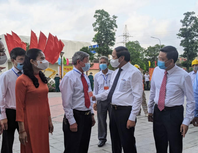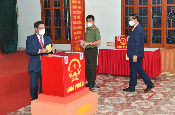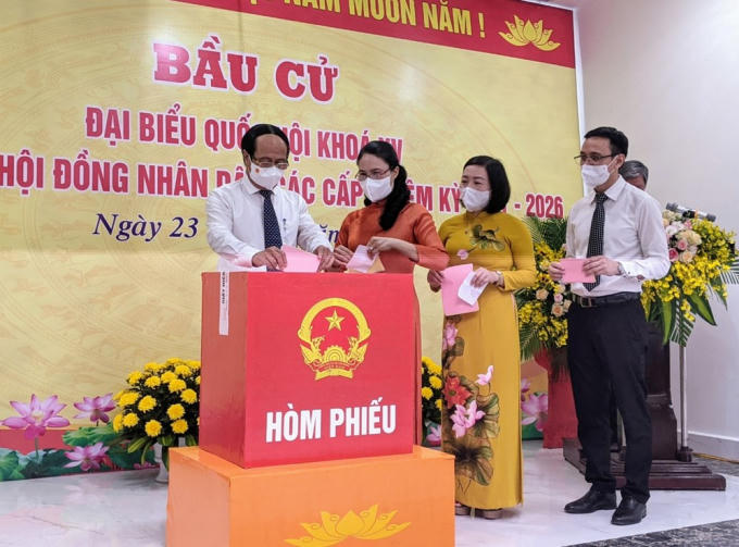 Phó Thủ tướng Chính phủ Lê Văn Thành cùng phu nhân và Trưởng Ban Tuyên giáo Thành ủy Đào Khánh Hà, Trưởng Ban Tổ chức Thành ủy Đào Trọng Đức tham gia bỏ phiếu.