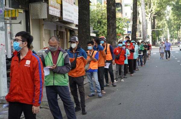 Tại trạm y tế lưu động trên đường Quang Trung, quận Gò Vấp, lúc 9h vẫn còn hơn 50 shipper chờ. Họ ngồi bệt xuống đất, sự mệt mỏi thể hiện trên gương mặt. Trước đó từ sáng sớm, tại điểm xét nghiệm này lấy mẫu cho hơn 400 người nhưng do lượng shipper quá đông, mẫu giấy xác nhận không đủ nên trạm phải chờ bổ sung. Chị Hà Linh Chi, cán bộ phụ trách trạm cho biết hai hôm nay, lượng shipper đến xét nghiệm tại đây tăng gần gấp đôi so với trước, từ 300 lên hơn 500 người. Điều này khiến đội ngũ xét nghiệm gặp nhiều áp lực, bởi còn rất nhiều công việc khác phải làm liên quan phòng chống dịch trên địa bàn.