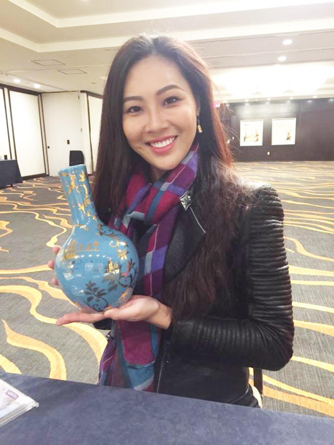 Chiếc bình hoa bằng gốm dát vàng có hình chùa Một Cột là vật phẩm mà Diệu Ngọc mang ra đấu giá từ thiện tại Miss World 2016.