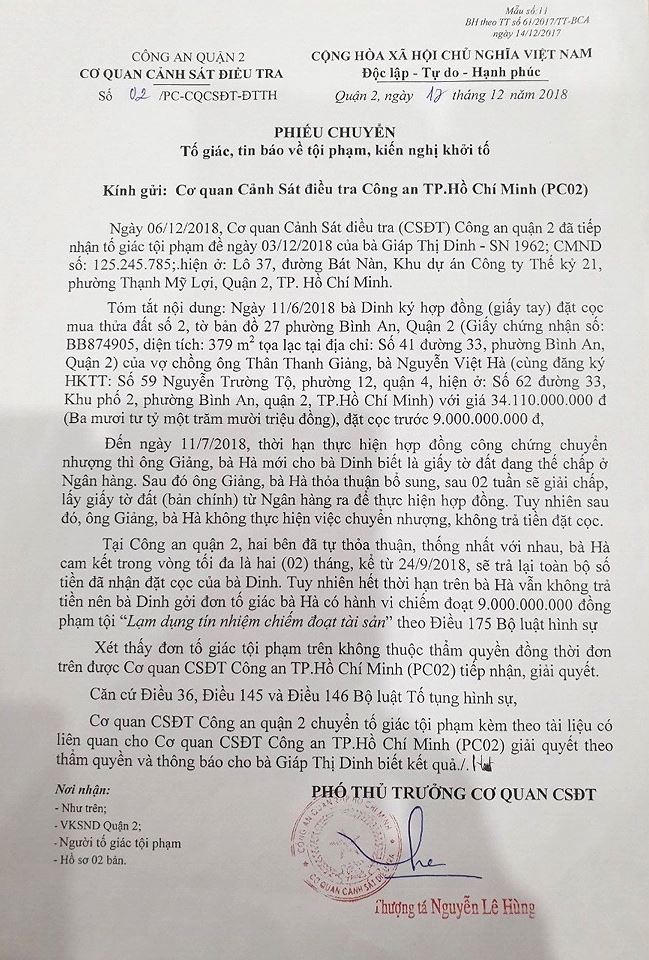 Tại Công an Quận 2, bà Hà cam kết tối đa 2 tháng, kể từ 24/9/2018, sẽ trả lại toàn bộ số tiền cọc của bà Dinh. Hết thời hạn trên, bà Hà vẫn không trả tiền nên bà Dinh gửi đơn tố giác bà Hà chiếm đoạt 9 tỷ đồng. Căn cứ Điều 36, Điều 145 và Điều 146 Bộ luật Tố tụng hình sự, Cơ quan CSĐT Công an Quận 2 chuyển đơn tố giác tội phạm kèm theo tài liệu có liên quan cho PC 02 Công an TP HCM giải quyết theo thẩm quyền.