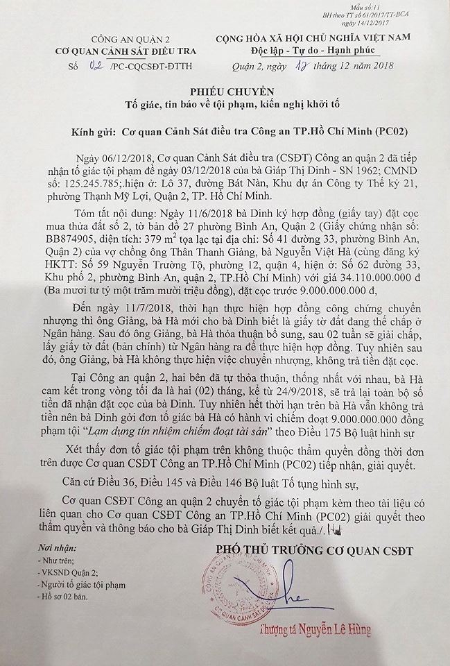 Chờ đợi mòn mỏi suốt hơn 2 tháng vẫn không thấy vợ chồng ông Giảng, bà Hà và con gái trả lại số tiền chiếm đoạt, bà Dinh tiếp tục có đơn tố giác tội phạm. Ngày 17/12/2018, thượng tá Nguyễn Lê Hùng - Phó thủ trưởng Cơ quan CSĐT Công an Quận 2, ký văn bản gửi Cơ quan CSĐT Công an TP HCM (PC02), xác định rõ: Ngày 11/6/2018 bà Dinh ký Hợp đồng đặt cọc mua 379m2 đất của vợ chồng ông Giảng, bà Hà với giá 34,11 tỷ đồng, đặt cọc trước 9 tỷ đồng.