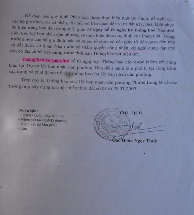 Trong khi ông Võ Văn Hạnh đang ngày đêm trông chờ sự giải quyết đơn tố cáo của chính quyền quận 9 thì ngày 12/5/2016, UBND quận 9 ra thông báo số 119/TB-UBND do bà Đặng Thị Hồng Liên, Chủ tịch UBND quận 9 ký về nội dung không thụ lý giải quyết tố cáo.