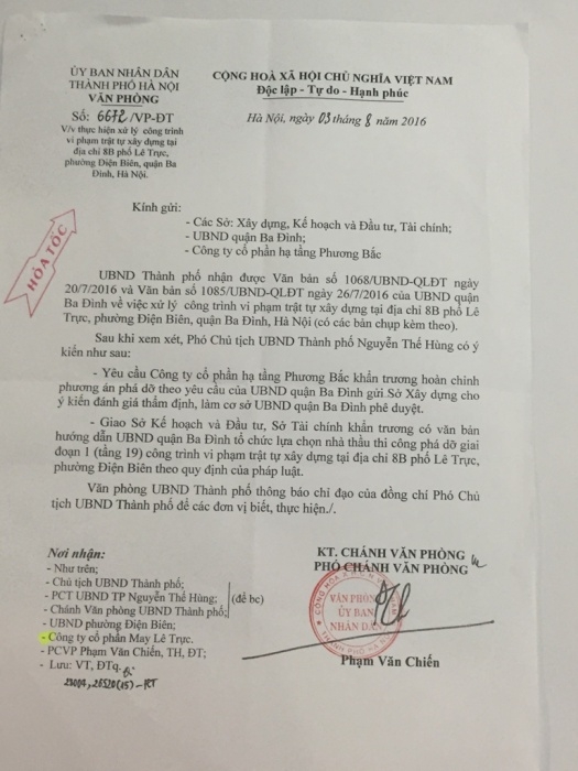 Cũng theo nội dung văn bản này, UBND thành phố Hà Nội yêu cầu: Cty cổ phần Hạ tầng Phương Bắc khẩn trương hoàn chỉnh phương án phá dỡ; Giao Sở Kế hoạch và Đầu tư, Sở Tài chính khẩn trương có văn bản hướng dẫn UBND quận Ba Đình tổ chức lựa chọn nhà thầu thi công phá dỡ giai đoạn 1 (tầng 19) công trình vi phạm trật tự xây dựng tại địa chỉ 8B phố Lê Trực, phường Điện Biên theo quy định của pháp luật.