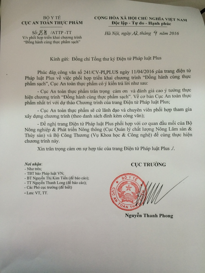 Để cụ thể hóa cam kết phối hợp, ngày 12/4, đại diện Bộ Y tế - Cục An toàn thực phẩm đã gửi công văn tới Pháp luật Plus về triển khai chương trình.
