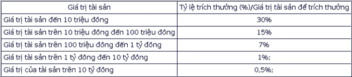 Trường hợp tổ chức, cá nhân ngẫu nhiên tìm thấy và giao nộp tài sản bị chôn, giấu, bị vùi lấp, chìm đắm là di tích lịch sử - văn hóa, bảo vật quốc gia, di vật, cổ vật, tài sản thuộc lĩnh vực quốc phòng, an ninh quốc gia thì mức tiền thưởng được tính theo phương pháp lũy thoái từng phần, cụ thể như sau: