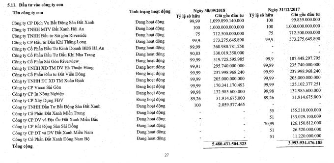 Theo báo cáo tài chính của Công ty Cổ phần Tập đoàn đất xanh (Mã DXG) báo cáo tài chính riêng giữa niên độ thì tính đến ngày 31/7/2017 Công ty này đã đầu tư vào công ty con là Công ty CP Bất động sản Sài Đồng số tiền là 126.150.812.000 đồng tương đương với 70,99% tỷ lệ sở hữu.