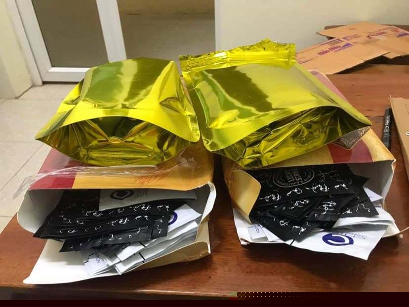 Tại hiện trường tổ công tác thu giữ 02 hộp giấy màu vàng bên ngoài có ghi dòng chữ “GINSENG TEA” bên trong có chứa 2 gói nilon màu vàng có các gói nhỏ chứa thực vật khô, màu xanh, khối lượng ước tính 200g, đối tượng khai nhận đó là cỏ Mỹ.
