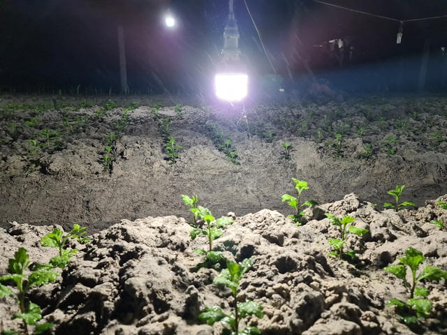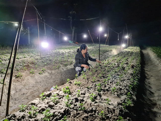 Để hoa phát triển tốt, kịp thu hoạch vụ Tết, ngoài việc làm đất, bón phân, tỉa cành, gia đình chị Thủy và người dân vùng lũ này đã phải chong đèn xuyên đêm giữa vườn hoa. Khi đó, hoa sẽ liên tục nhận năng lượng từ ánh sáng và quang hợp để lớn nhanh, nở đúng thời gian họ mong muốn.