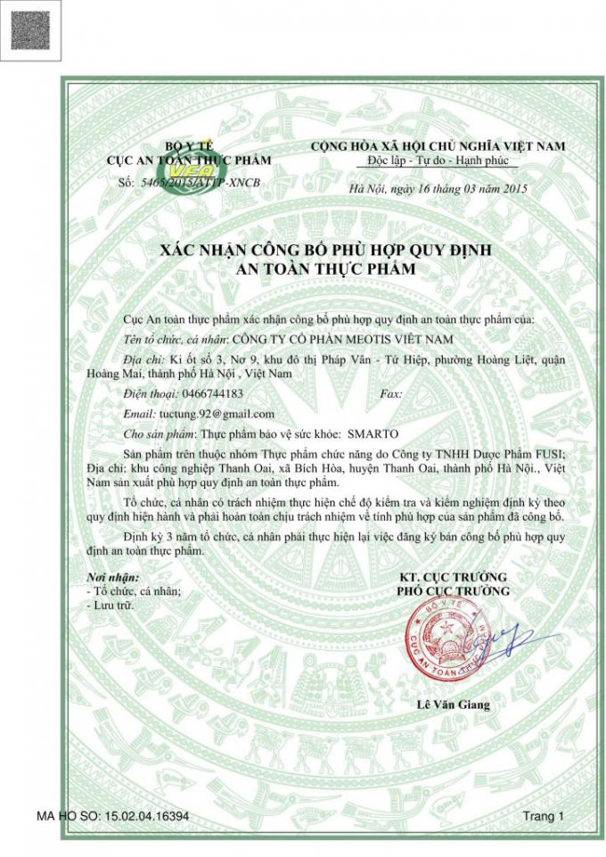 Như đã thông tin, theo giấy phép xác nhận công bố phù hợp an toàn thực phẩm số 5465/2015/ATTP-XNCB của Cục An toàn Thực phẩm - Bộ Y tế, Smarto là thực phẩm chức năng của Công ty Cổ phần MEOTIS Việt Nam, địa chỉ tại Ki ốt số 3, No9, Khu đô thị Pháp Vân - Tứ Hiệp, phường Hoàng Liệt, quận Hoàng Mai, Hà Nội.