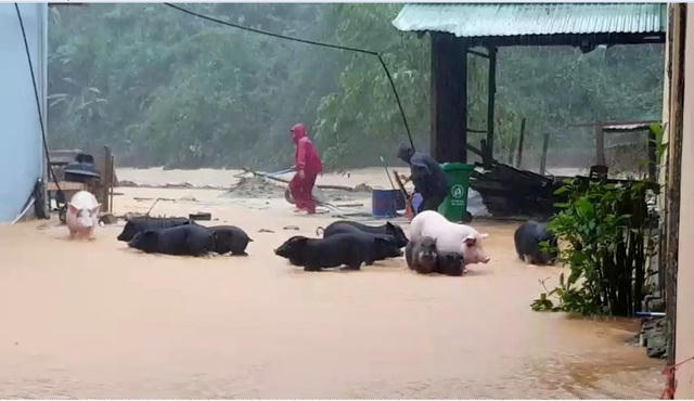 Đàn heo của nhà trường được di chuyển lên cao tránh bị lũ cuốn trôi