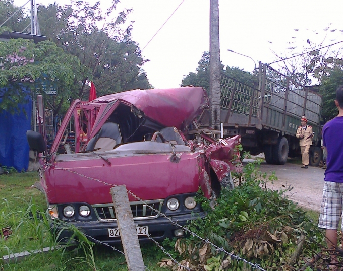 Cú va chạm mạnh khiến anh Lành và 2 người ngồi trên xe khách bị thương, hai xe hư hỏng nặng, nhất là xe khách bị biến dạng phần đầu và mui xe.