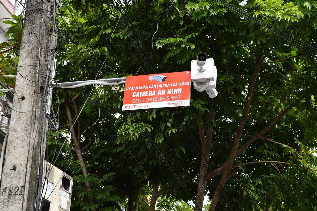 Một điểm lắp đặt camera an ninh có thông tin đường dây nóng của thị trấn Cái Rồng.