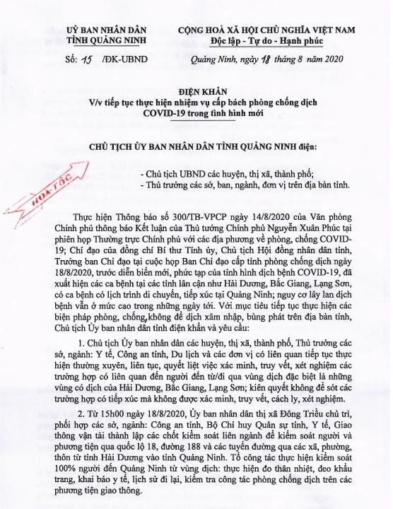 Hôm nay (18/8), UBND tỉnh Quảng Ninh ban hành Điện khẩn số 15 /ĐK-UBND về việc tiếp tục thực hiện nhiệm vụ cấp bách phòng chống dịch COVID-19 trong tình hình mới.