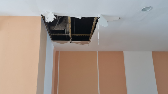 Hệ thống trần thạch cao bị nưỡc mưa thấm xuống làm hư hỏng .