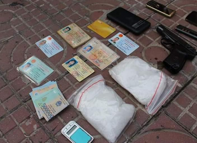 Qua kiểm tra, lực lượng công an phát hiện đối tượng mang theo 2 túi ma túy (loại ma túy đá trọng lượng 0,4 kg), 1 khẩu súng ngắn K59, 5 viên đạn, 1 hộp tiếp đạn, 1 chiếc cân tiểu ly, 3 chiếc điện thoại di động, số tiền trên 1,7 triệu đồng và một số giấy tờ liên quan.