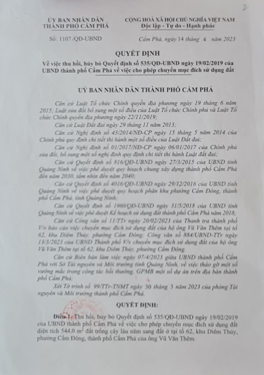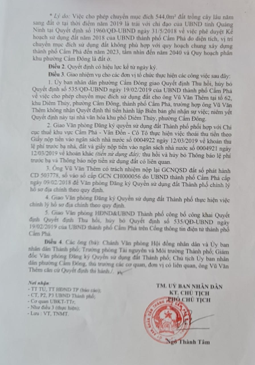 Thế nhưng, đến ngày 14/4/2023 ông Ngô Thành Tâm, Phó Chủ tịch UBND TP Cẩm Phả đã bất ngờ ban hành Quyết định số 1107/QĐ-UBND về việc thu hồi và huỷ bỏ Quyết định số 535/QĐ-UBND ngày 19/2/2019 của UBND TP Cẩm Phả về việc cho phép chuyển mục đích sử dụng đất diện tích 544m2 đất trồng cây lâu năm sang đất ở.
