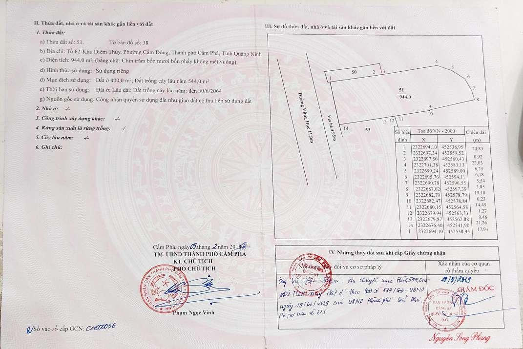 Và được Văn phòng Đăng ký quyền sử dụng đất TP Cẩm Phả đã chỉnh lý biến động tại Giấy chứng nhận quyền sử dụng đất số CD503778 ngày 18/3/2019 theo quyết định số 535/QĐ-UBND ngày 19/2/2019 của UBND TP Cẩm Phả.