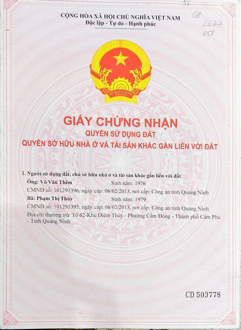 Mặt trước của giấy chứng nhận quyền sử dụng đất của ông Vũ Văn Thêm và bà Phạm Thị Thuý được UBND TP Cẩm Phả cấp.