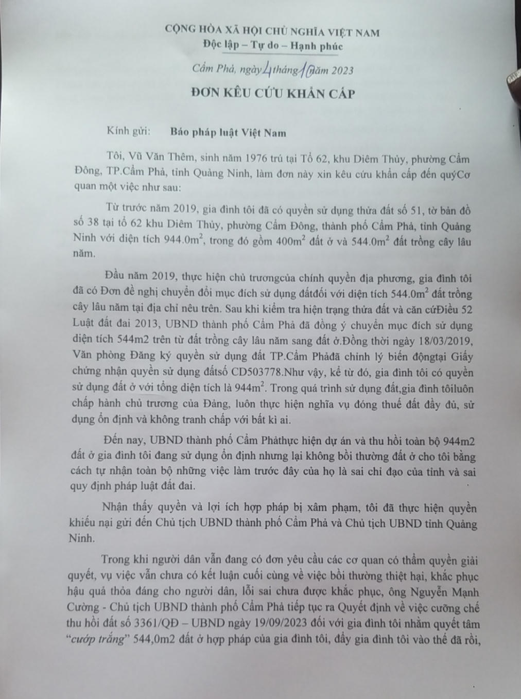 Báo Pháp luật Việt Nam nhận được nội dung đơn kêu cứu khẩn cấp của ông Vũ Văn Thêm, sinh năm 1976 trú tại Tổ 62, khu Diêm Thủy, phường Cầm Đông, TP Cẩm Phả, tỉnh Quảng Ninh phản ánh về việc UBND TP Cẩm Phả ra Quyết định thu hồi và huỷ bỏ Quyết định chuyển mục đích sử dụng đất từ đất trồng cây lâu năm sang đất ở đối với diện tích 544m2 đã được cấp giấy chứng nhận quyền sử dụng đất để thực hiện dự án tuyến đường nối Vũng Đục phường Cẩm Đông đến phường Cẩm Sơn TP Cẩm Phả giai đoạn 1 đã ảnh hưởng nghiêm trọng đến quyền và lợi ích hợp pháp của gia đình ông khi nhà nước thu hồi đất.