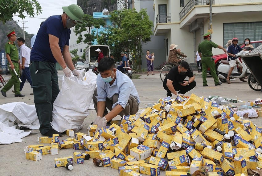 Nhận được tin báo từ người dân, đoàn kiểm tra đã tới hiện trường để xác minh, kiểm đếm số thực phẩm chức năng bị đổ bỏ. Nhà chức trách xác định số thực phẩm chức năng này chưa được sử dụng, được chất đầy 13 xe chở rác, gồm siro, nước yến sào, đông trùng hạ thảo, vitamin, thuốc nhuộm tóc... Nhiều sản phẩm đã hết hạn sử dụng.