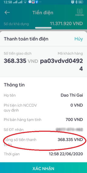 Bảng thông báo tiền điện của hộ gia đình bà Gái được thể hiện cụ thể bằng chữ.
