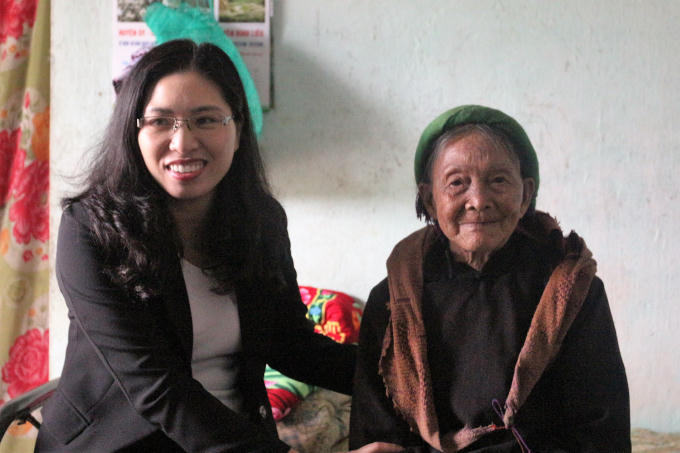 Bà Nguyễn Thị Tuyết Hạnh Chủ tịch UBND huyện thăm hỏi tặng quà Tết mẹ liệt sĩ.