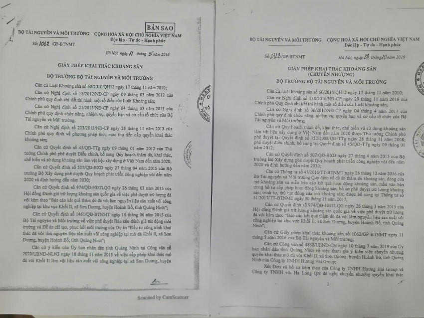 Theo nội dung Biên bản làm việc về việc kiểm tra, theo phản ánh của người dân liên quan đến hoạt động khai thác, sản xuất, kinh doanh tại mỏ đá vôi khối II của Công ty TNHH Vôi Hạ Long QN, về hồ sơ pháp lý liên quan. Giấy phép khai thác khoảng sản số 1062/GP-BTNMT ngày 11/5/2016 của Bộ Tài nguyên Môi trường. Giấy pháp khai thác khoáng sản (chuyển nhượng) số 2728/GP-BTNMT ngày 28/10/2019 của Bộ Tài nguyên Môi trường.
