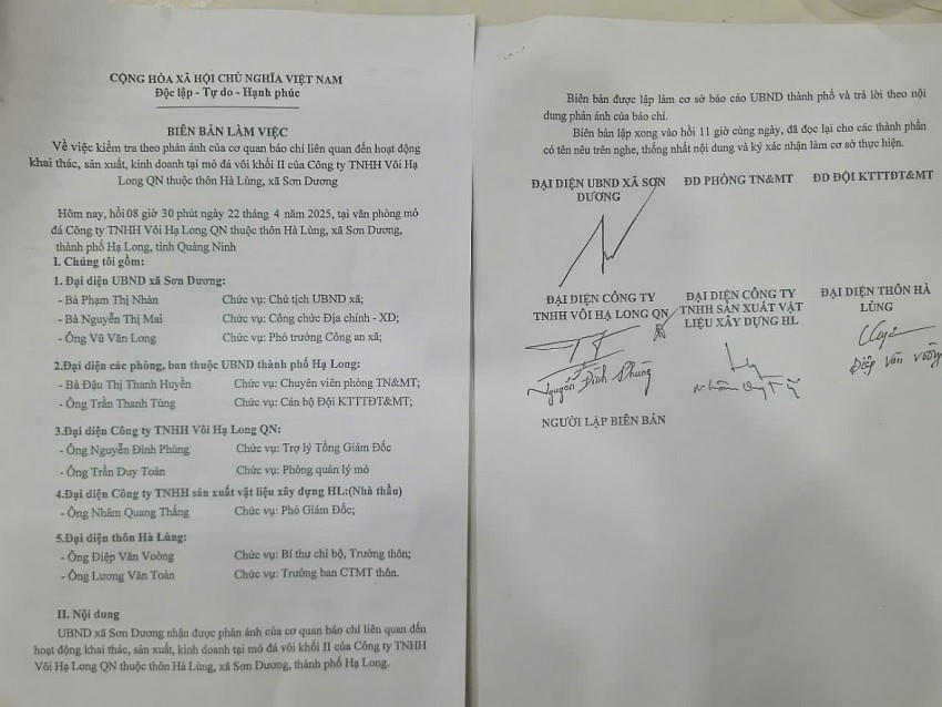 Tại buổi làm việc, ông Nguyễn Đình Phùng, đại diện Công ty TNHH Vôi Hạ Long QN cho biết: "Công ty chúng tôi khẳng định đang khai thác và sử dụng đúng theo ranh giới được thuê đất theo Quyết định số: 5478/QĐ-UBND ngày 26/12/2019 của UBND tỉnh Quảng Ninh, cho Công ty TNHH Vôi Hạ Long QN thuê thực hiện Dự án khai thác đá vôi làm nguyên liệu sản xuất vôi công nghiệp tại xã Sơn Dương, huyện Hoành Bồ, nay huộc TP Hạ Long, tỉnh Quảng Ninh.