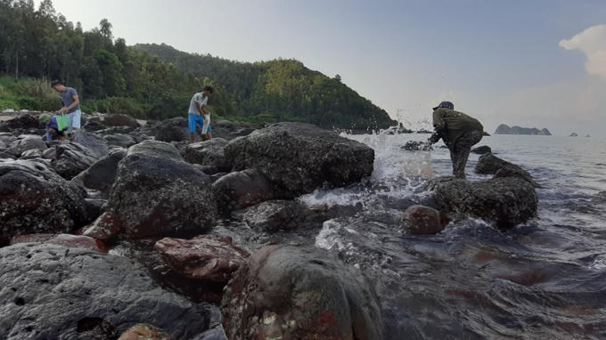 Vừa cặm cụi nhặt ốc từ những khe đá, chỉ chừng vài chục phút anh Khánh đã bắt được cả kg ốc màu to chừng đầu ngón tay cái.