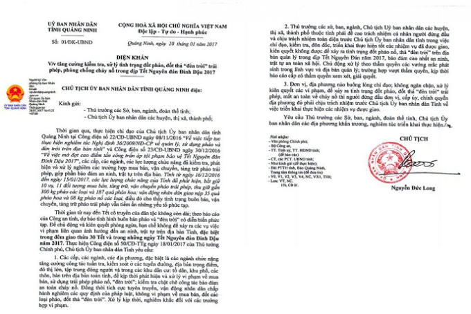 Trước tình trạng ấy, ngày 20/1, UBND tỉnh Quảng Ninh đã ban hành công điện khẩn số 01/ĐK-UBND) do Chủ tịch UBND tỉnh, ông Nguyễn Đức Long ký về việc tăng cường kiểm tra, xử lý tình trạng đốt pháo, đốt thả “đèn trời” trái phép, phòng chống cháy nổ trong dịp Tết Nguyên đán Đinh Dậu 2017.