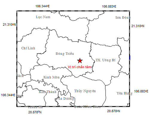 Theo đó, vào khoảng 21h15 (giờ GMT) tức 04h15 (giờ Hà Nội) ngày 03/7 một trận động đất có cường độ 2,5 độ richter xảy ra tại vị trí có tọa độ (21.087 vĩ độ Bắc,106.646 độ kinh Đông), độ sâu chấn tiêu khoảng 12 km. Vụ động đất xảy ra tại huyện Đông Triều, tỉnh Quảng Ninh.