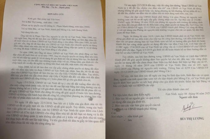 “Tuy nhiên, sau khi làm xong đường UBND xã Vạn Ninh và lãnh đạo UBND TP đã giải quyết không đảm bảo quyền lợi cho gia đình tôi, đến nay việc công nhận quyền sử dụng đất vẫn chưa đươc thực hiện. Vì vậy chị tôi đã gửi đơn kiến nghị đến các cơ quan chức năng trong tỉnh và TP Móng Cái mong các cơ quan chức năng nhanh chóng giải quyết kiến nghị của gia đình tôi, đảm bảo quyền và lợi ích cho gia đình tôi, đặc biệt ông tôi, bố tôi lại là người có công với cách mạng, là một cựu chiến binh ông đã khai hoang, mở hỏa diện tích đất để phát triển kinh tế gia đình từ xưa đến nay. Chúng tôi móng muốn cơ quan chức năng sớm giải quyết thấu đáo những kiện nghị của gia đình tôi”, chị Lương bày tỏ.