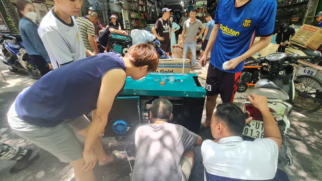 Nhiều chủ cửa hàng máy phát điện phải huy động thêm người nhà đến hỗ trợ và chỉ cho người dân cách vận hành máy phát điện.