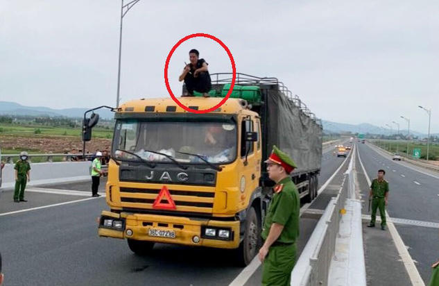 Đối tượng ngáo đá cố thủ trên nóc xe tải.